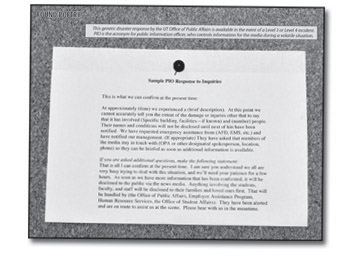 Public universities also delegate PIO authority in case of an emergency, and I found this "Sample PIO Response to Inquiries" buried in the UT Web site. I later printed it out and put it in The Daily Texan, which is where this document is taken from, but the original can be found in its primary form here.