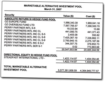 Finally, UTIMCO released a compact, one-page list of their investments in some select hedge funds and private equity firms (they refer to both of these funds as "alternative investments"), as of December 31, 2006. This does not include all such investments, but is extremely useful in tracking down the key principal(s) that manage these (as of now) unregulated funds.